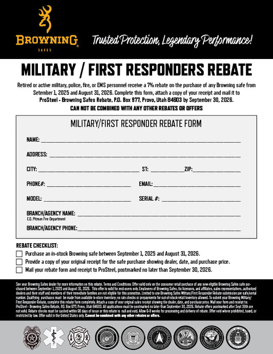 To take advantage of the discount, eligible customers must complete the Military/First Responder Rebate form, which requires providing identification, the name of the military branch or department (E.G. Pitman Fire Department) you worked in, and a current phone number for that branch/department. Mail in the completed form along with a copy of your receipt from any Browning Safes purchase between September 1, 2025 and August 31, 2026.
